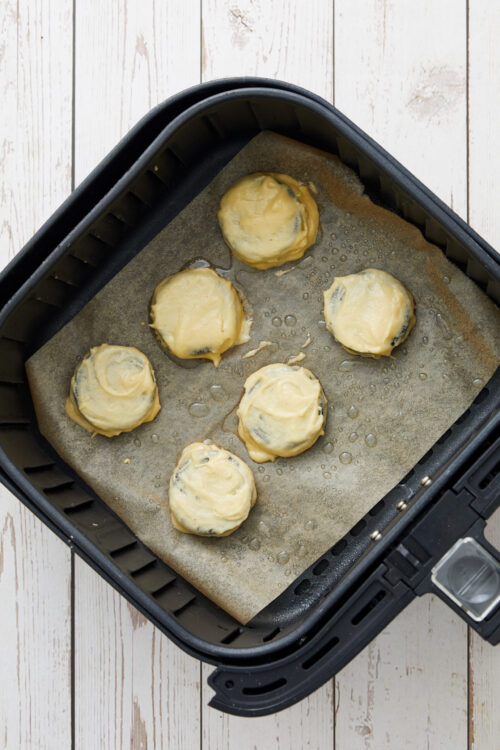 Dip each cookie into the batter so it is fully coated. Place the coated cookies in a single layer in the air fryer basket, leaving enough space between each cookie. Work in batches as needed.