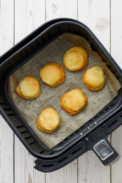 Then place the cookies, folded dough side down, on the oil-sprayed parchment paper in a preheated air fryer set to 350°F. You will notice that the crescent dough cookies use a lower heat than the battered ones in the recipe below. Keep an eye on them during cooking, as they may turn golden a little sooner than the battered ones.