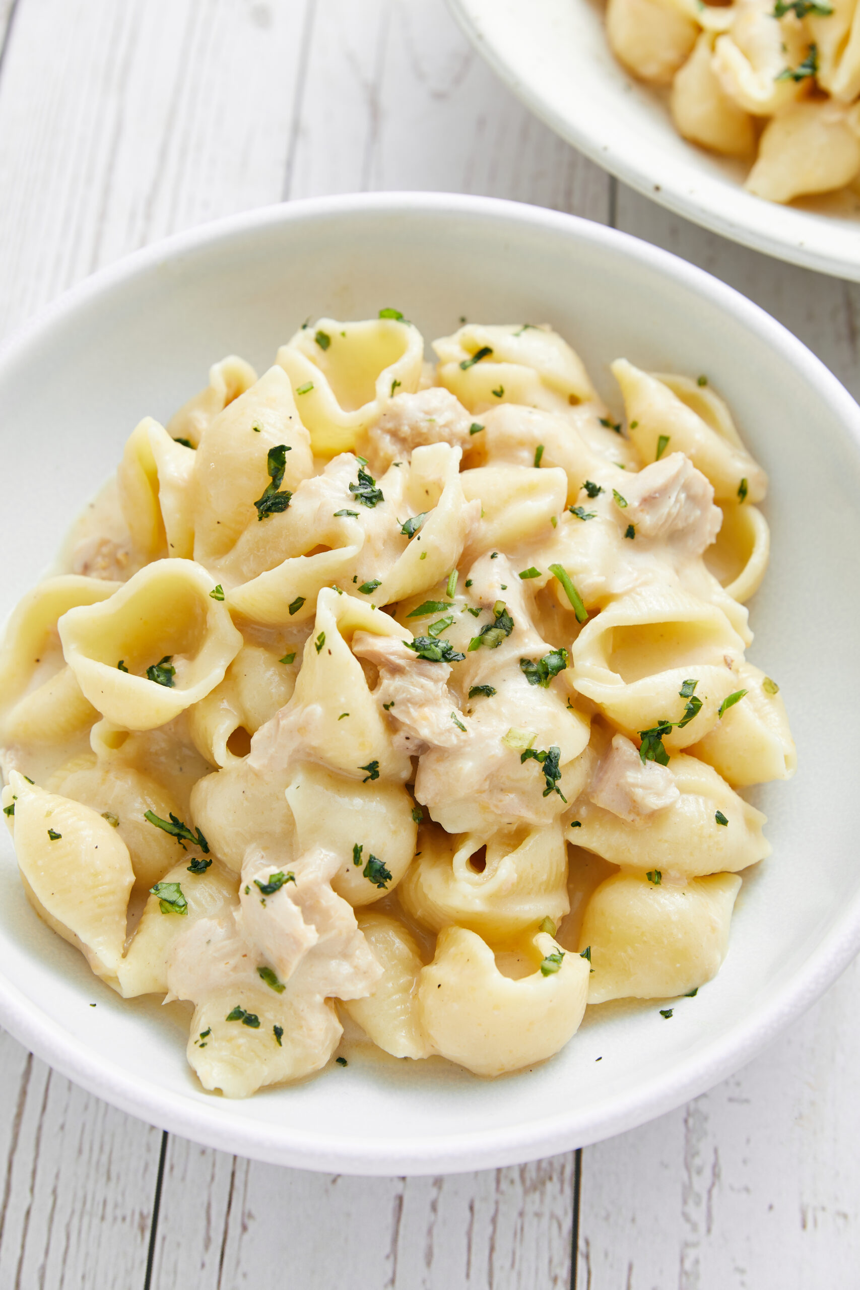 Other options are tubular pasta shapes, such as paccheri, rigatoni, penne, ziti, and even elbow macaroni. Don’t confuse elbows with lumache—curved shapes that look like snails. They do a great job as a base for this dish, as well. Twirly pasta like fusilli, rotini, and gemelli can also work in this dish. My last recommended shape is farfalle—or little bow ties. These ruffle-edged pasta shapes also have crevices that are ideal to hold the tuna and cheese.