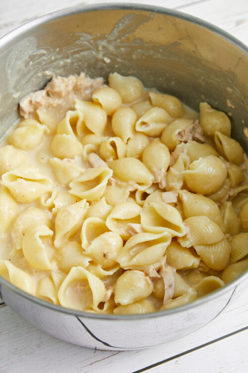 One of the reasons I like to use shell pasta in this tuna helper recipe is that the cheese and tuna work their way into the openings, so every bite is filled with a yummy surprise. Little shells have always been one of my favorite shapes. Orecchiette is my second favorite for this dish, as it also provides an ear-shaped resting place for the fillings. If you really want to have fun with this dish, try using rotelle—those cute little wagon wheel shapes. The tuna and cheese fill the spokes of the wheels for edible enjoyment.