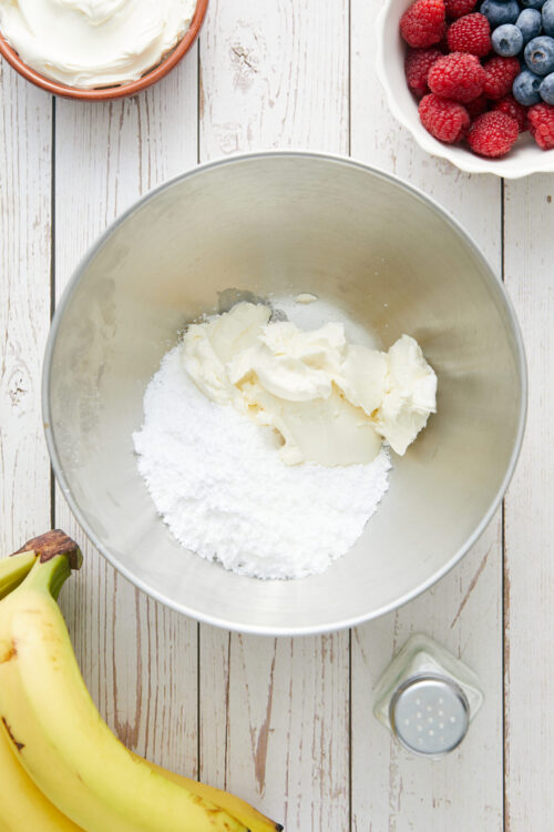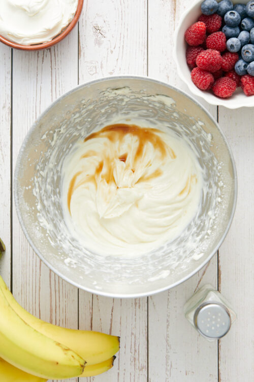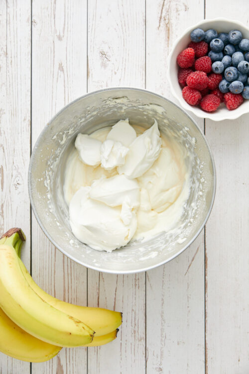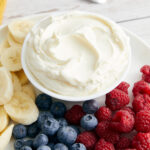 Another version of this dip combines four ounces of softened cream cheese, eight ounces of thawed Cool Whip, and seven ounces of Marshmallow Fluff. I’ve always seen this dip with either the fluff or the whipped topping, never both together, so it is a double-sweet treat. One of the easiest ways to switch up the flavor of this dip is by using a fruit-flavored cream cheese. Strawberry fruit dip is always a hit—but my favorite is blueberry!